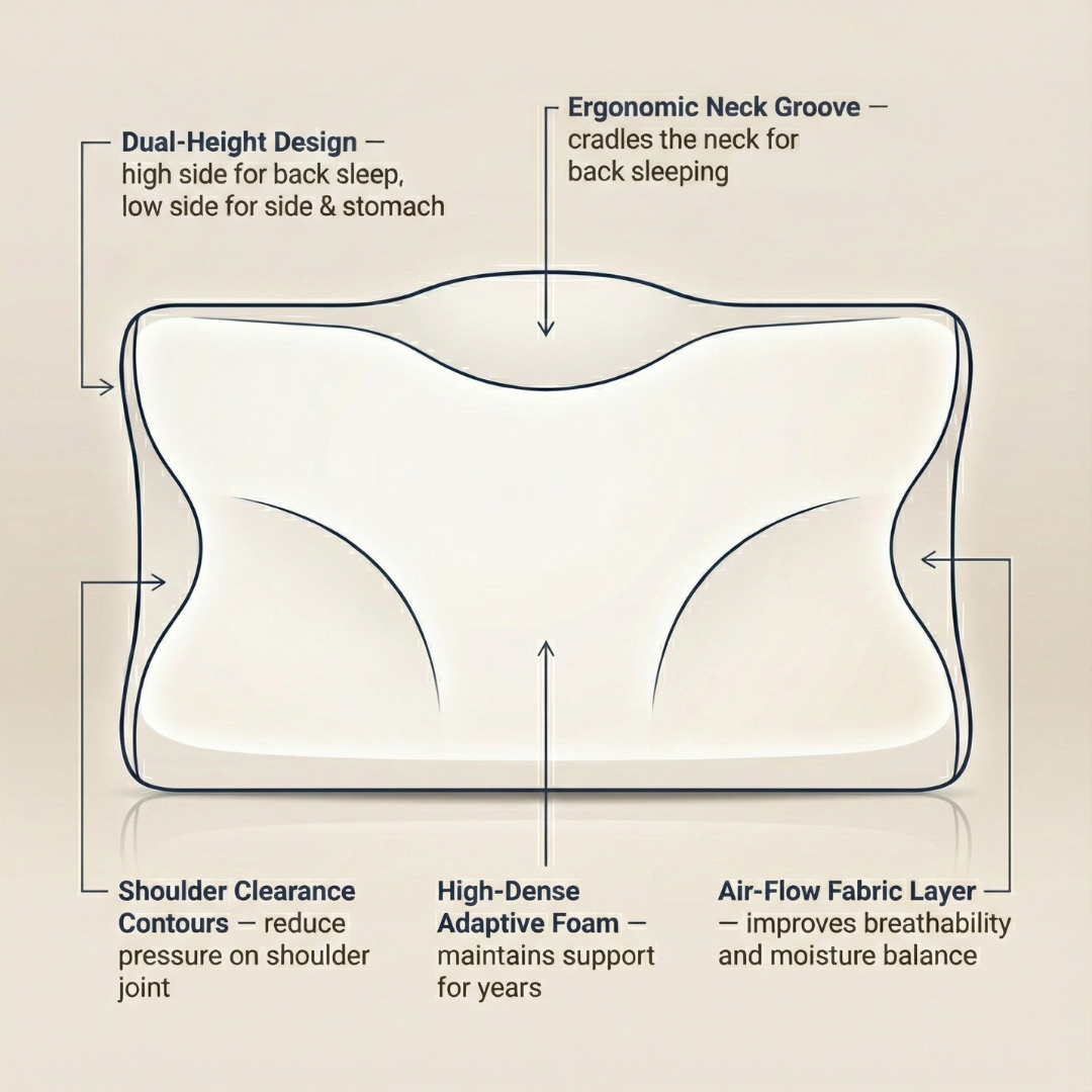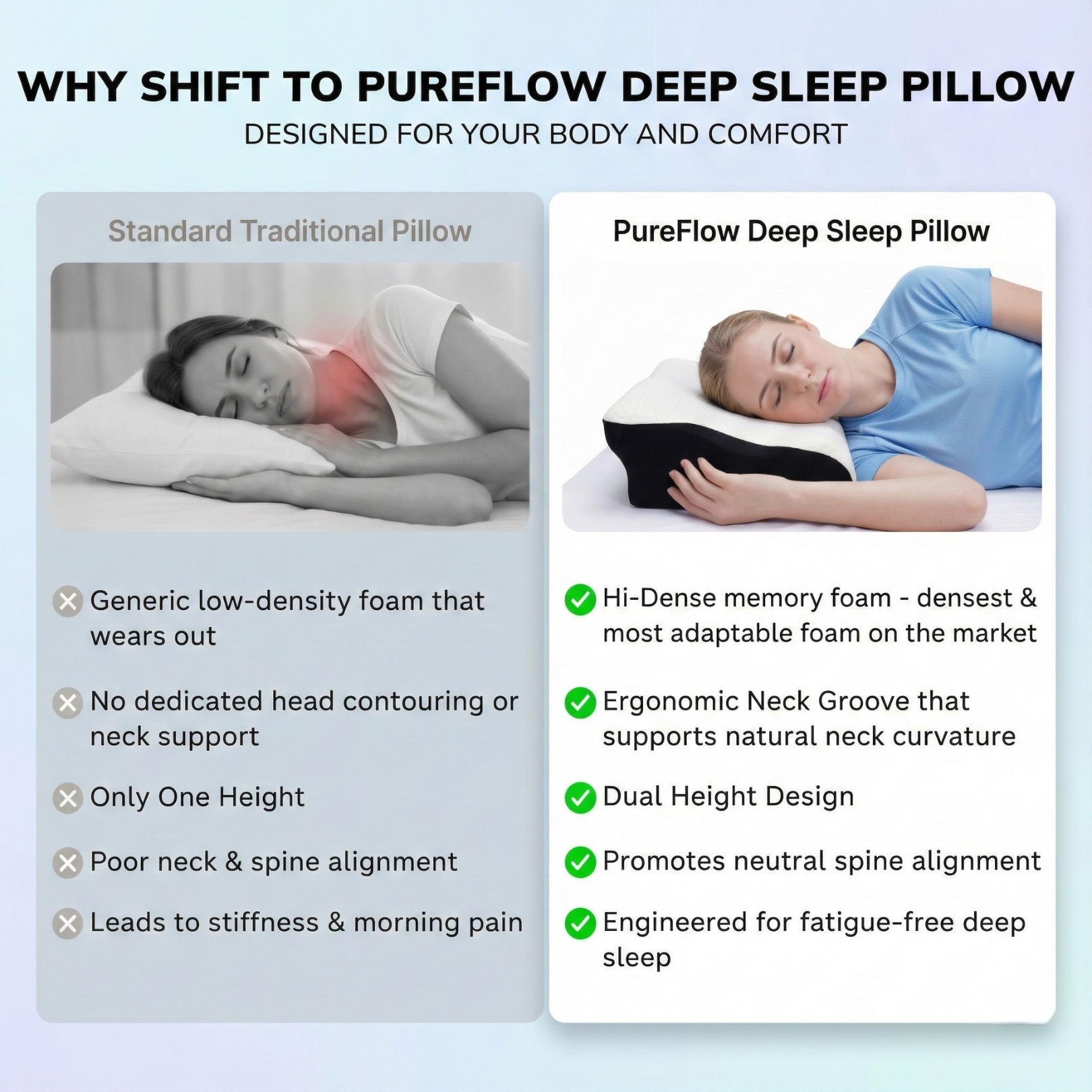 The PureFlow Deep Sleep Pillow uses Hi-Dense adaptive foam and an ergonomic dual-height design to support your neck, align your spine, and help you sleep better through the night.